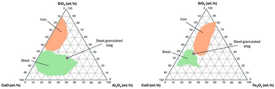 Ternary diagrams for the identification of slags based on SiO2, Al2O3, and CaO (left side) and SiO2, Fe2O3, and CaO (right side). Orange and green shaded areas represent typical areas for iron (blast furnace) and steel slag (basic oxygen furnace). Reference [64].