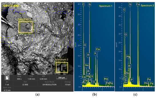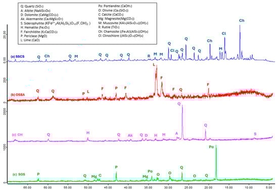 The FTIR spectrum of the SSCS shows that bands associated with the stretching vibrations of the O-H group [33], which denote the presence of absorbed water, are located at 3381 and 3626 cm−1, while for the OSBA, these appear at 3004 cm−1. The SGS FTIR pattern shows that the stretching vibration of O-H appears at 3097 cm−1. The stretching vibration of the C-O group, associated with the carbonate content [19,66,67], was observed as peaks at 1419 cm−1 for OSBA and 1413 for SGS. Neither SSCS nor CH showed peaks related to the C-O group stretching vibration.
