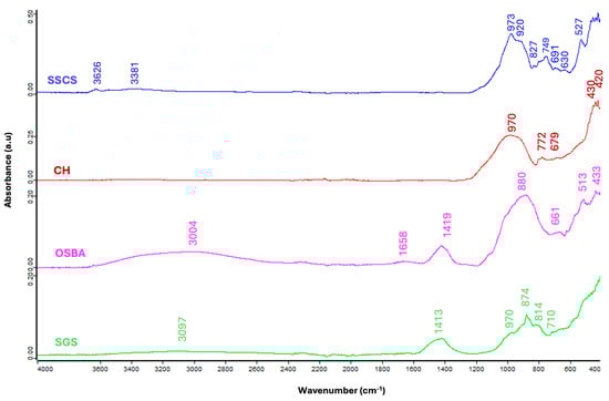 Attenuated total reflection Fourier transform infrared spectroscopy (ATR-FTIR) Jasco Analytica model 6800 FV (Jasco International Co., Ltd., Heckmondwike, UK) analysis was employed to identify the functional groups of SSCS, CH, OSBA, and SGS, as depicted in Figure 5.