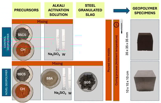 Once the precursor materials were prepared and the two different alkali activators were elaborated, the subsequent step was to weigh the precursor materials, alkali solution, and steel granulated slag for the novel geopolymer. The control geopolymer pastes were poured into prismatic molds with internal dimensions of 35 × 35 × 35 mm, producing seven specimens for each formulation. The novel geopolymer concrete pastes were set in prismatic molds of 100 mm × 100 mm × 100 mm for the seven specimens. Samples of both formulations were vibrated on a vibration table for 30 s.