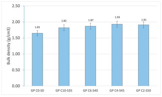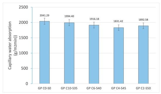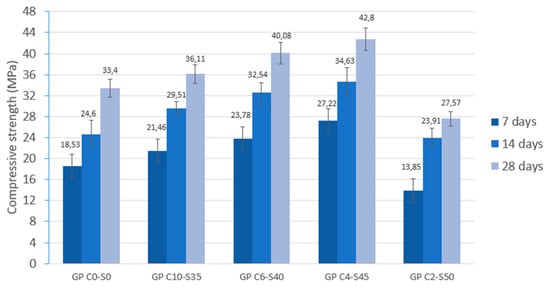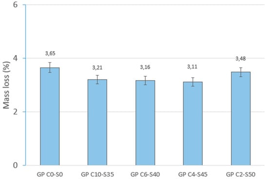 The percentage of mass loss is related to the loss of free water in the mortar. The control family (GP C0-S0) was formed with 8% H2O, while in the rest of the families studied. the percentage of water remained constant (18%). GP C0-S0 showed a lower mass loss (3.65%) than GP C10-S35 (3.21%) and GP C6-S40 (3.16%) during the curing process. However, when aggregates were incorporated into the mix, the mass loss was reduced, reaching its lowest value (3.11%) when the aggregate content was 45% (GP C4-S45). This can be attributed to the fact that the SGS improves the efficiency of the geopolymer reaction by providing a larger interaction surface area and contributing to the retention of water in the pores and on the surface of the particles. However, as the aggregate content increased to 50% (GP C2-S50), the mass loss showed an increase (3.48%), suggesting that an excess of SGS may affect the cohesion of the geopolymer matrix and facilitate the release of entrapped water. Figure 7 shows the mass loss percentages (%) of the geopolymer families.