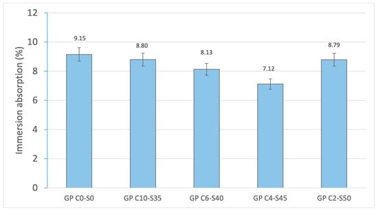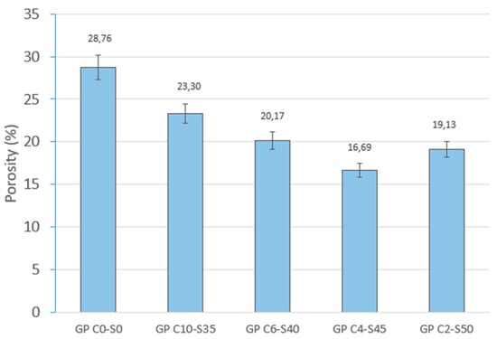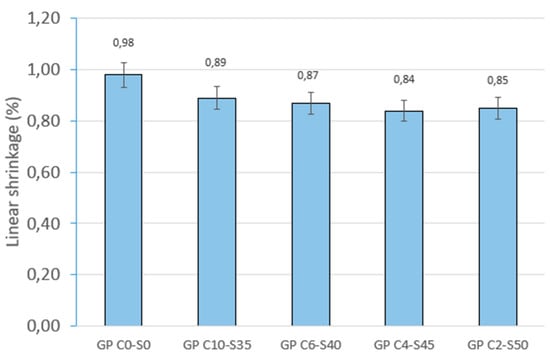 The results obtained for linear shrinkage (%) (Figure 8) show that GP C0-S0 presents the highest shrinkage (0.98%). As SGS is incorporated into the mix, the shrinkage decreases progressively, reaching its lowest value in GP C4-S45 (0.84%). However, in the sample with the highest aggregate content (GP C2-S50), shrinkage exhibits a slight increase (0.85%).