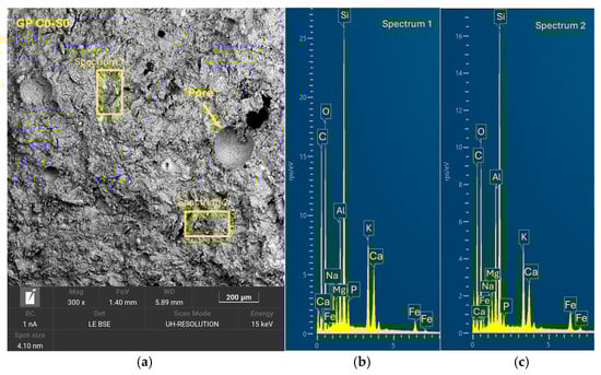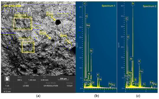 - The higher proportion of SGS in the formulation fostered a more uniform and cohesive matrix, which was likely linked to the increased mechanical strength compared to other formulations. The reduction in the Si/Al molar ratio in these mixtures facilitated the formation of a dense and homogeneous geopolymeric network, supporting the hypothesis that an optimal SGS proportion enhances matrix cohesion.