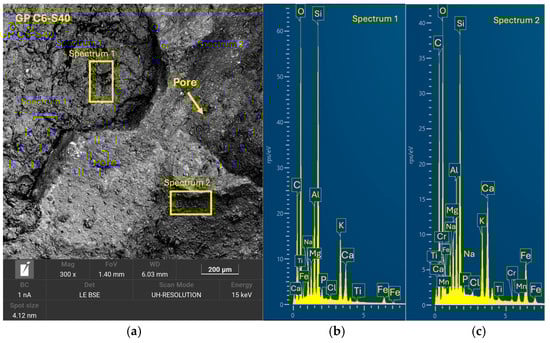 The slate stone contains significant amounts of silica (SiO2) and alumina (Al2O3), which promote an effective geopolymerization reaction in the presence of an alkaline activator solution. This observation is supported by the SSCS sample, which is primarily composed of silica (52.85 wt.%) and alumina (21.35 wt.%), yielding a SiO2/Al2O3 ratio of 2.47. This indicates that alkali gel formation will occur [56], contributing to the mechanical properties of the target geopolymer [57]. Other oxides, such as iron oxide (10.74 wt.%) and magnesium oxide (2.82 wt.%), were also found to play important roles in the development of suitable mechanical characteristics for the geopolymer. The calculated loss on ignition (LOI) was 5.02 wt.%.
