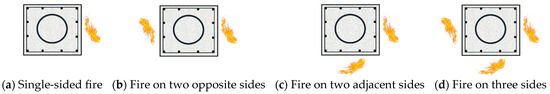 Although the aforementioned scholars have conducted extensive research on various properties of ST-RC columns, they have not addressed the scenario of non-uniform fire exposure. During a fire, columns are not always subjected to fire on all four sides; instead, non-uniform fire exposure is more common, as illustrated in Figure 2. Many researchers have already recognized this issue. Lama [16] performed nonlinear analysis and design of CFST columns under non-uniform fire exposure, revealing that for certain slender columns with a load ratio below 0.47, low fire resistance ratings fail to meet design requirements. This underscores the importance of selecting an appropriate load ratio. Meng [17] investigated the fire resistance of steel tube-filled reinforced concrete columns but did not develop a method to predict their fire resistance under non-uniform fire conditions. Mao [18], after selecting an appropriate load ratio, studied the fire resistance of such columns and proposed an improved calculation method to predict their fire resistance. Guo [19] also developed a 3D finite element model to predict the ultimate bearing capacity of CFST columns under non-uniform fire exposure. While these studies focused on non-uniform fire exposure, they did not examine the post-fire performance of structural members. Lyu [20] and Xu [21] investigated the seismic performance of composite members after non-uniform fire exposure. However, research on the seismic performance of ST-RC columns following non-uniform fire exposure has yet to make significant progress.