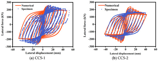 Due to the lack of experimental data on low-cycle reciprocating tests of ST-RC columns after fire exposure, this paper indirectly validates the results by simulating seismic damage tests of ST-RC columns and post-fire seismic damage tests of CFST columns in Abaqus (6.12, Dassault Systèmes, PAR, FR). The test parameters are listed in Table 1, and the comparison between the calculated results and the experimental results is shown in Figure 4 and Figure 5.