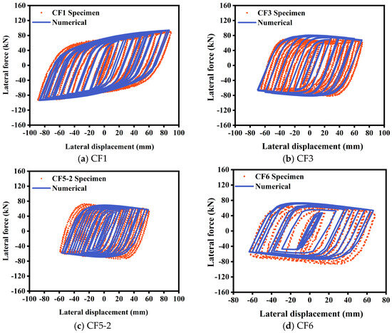 Figure 5 presents a comparison between the experimental and calculated hysteresis curves from seismic tests on CFST columns after fire exposure. The calculated results show excellent agreement with the experimental results, with accurate correspondence in peak values for each loading cycle. The pinching effect, typically observed in bow-shaped hysteresis curves, is less pronounced in the calculated spindle-shaped hysteresis curves, resulting in a negligible impact.
