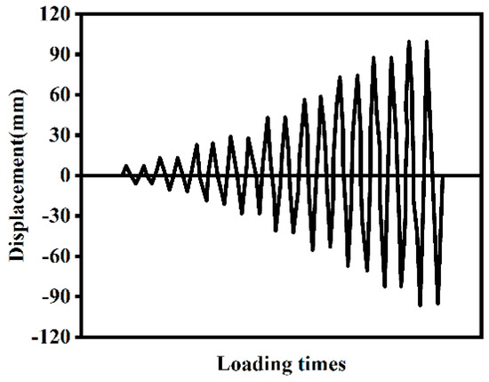 The numerical analysis model of the ST-RC column is established in accordance with the standards GB 50936 [31] and T/CECS [32] to enable a more precise analysis of the seismic performance of ST-RC columns after fire on one side. The specific parameters are detailed in Table 2, and the constructed model is illustrated in Figure 7. The heating time, based on Tang [33], is set to 120 min. The loading protocol, as depicted in Figure 8, adheres to the guidelines of JGJ/T 101-2015 [34]. For displacements less than 20 mm, each loading increment is 5 mm with two cycles; for displacements exceeding 20 mm, each loading increment is 10 mm with two cycles, continuing until failure.