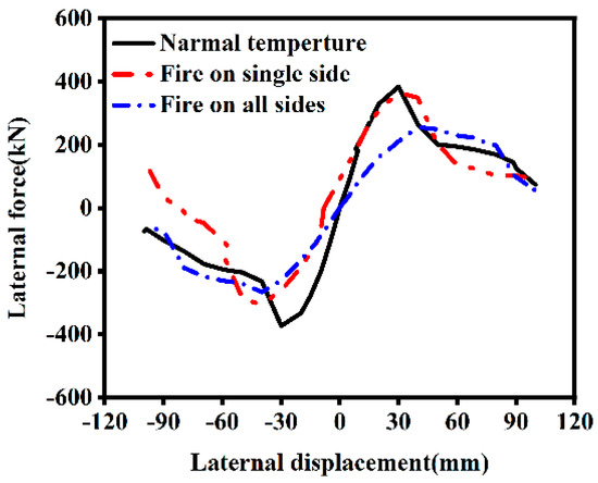Hysteresis curves provide valuable insights into the strength, stiffness, ductility, and energy dissipation capacity of a structure. Figure 9 illustrates the relationship between horizontal force and loading displacement for ST-RC columns under cyclic loading after fire on one side. The hysteresis curves of the components after fire on one side are spindle-shaped and relatively full, indicating that the components primarily undergo bending deformation. The large enclosed area of the curves reflects the strong plastic deformation capacity and excellent seismic performance of the components, both at normal temperature and after fire on one side.