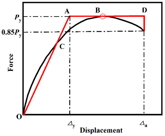 The ductility of a component reflects its ability to deform under load and can be quantified using the ductility coefficient and the ultimate displacement. When the yield displacement of a component is large, even if the ultimate displacement is also substantial, the ductility coefficient may remain small. Consequently, the ductility coefficient is a reliable metric for comparing the ductility of components only when their yield displacements are similar. In cases where yield displacements differ significantly, the ultimate displacement should be used as the basis for comparison. The ductility coefficient is defined as the ratio of the ultimate displacement to the yield displacement. The yield displacement is determined using the equal energy method, as illustrated in Figure 12, while the ultimate displacement corresponds to the displacement at 85% of the peak load [15].