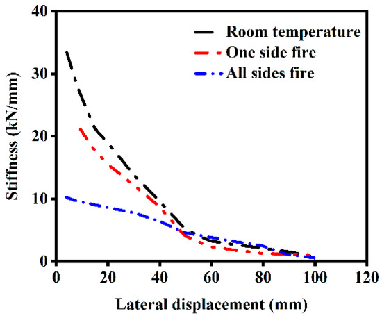 - The initial stiffness of members exposed to fire on one side decreased by 24.69% compared with that of non-fire members, while the stiffness of members exposed to fire on all sides decreased by 69.37% compared with that of non-fire members. It can be seen that the greater the fire exposure, the smaller the initial stiffness, because the elastic modulus of the steel cannot be restored to its initial state after the fire.