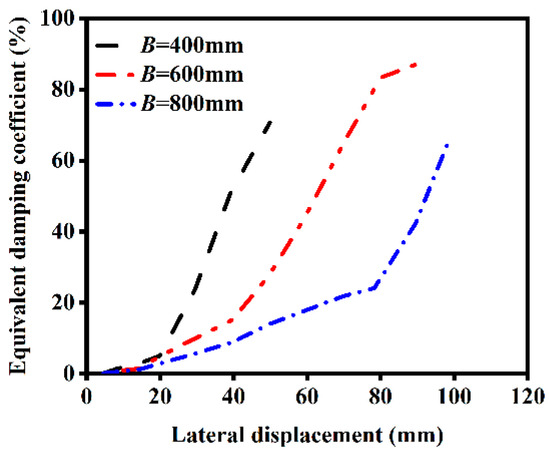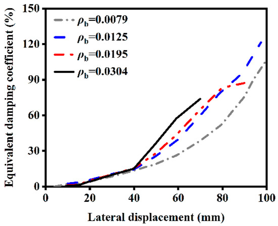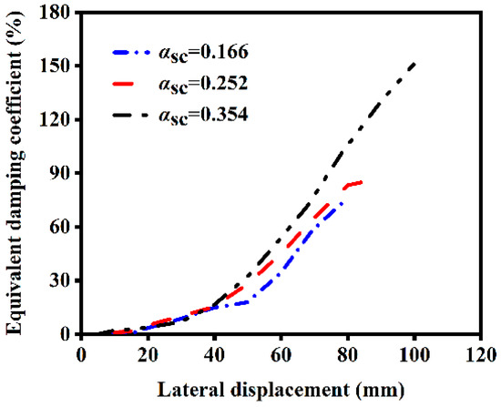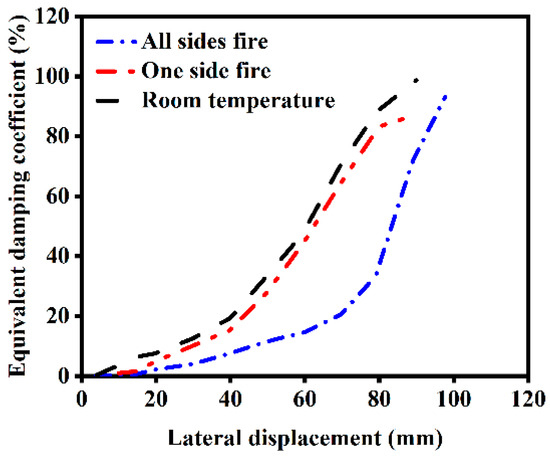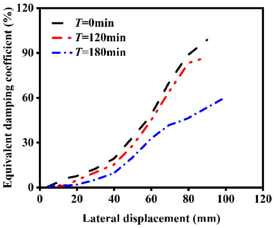 The influence of different heating times on the ST-RC columns after fire on one side is shown in Figure 18. As shown in the figure, as the heating time increases, the energy dissipation capacity of the component decreases after fire exposure on one side. This occurs because fire exposure weakens the material properties of the component, leading to degradation in strength and stiffness, and a reduction in energy dissipation capacity. Consequently, longer heating durations result in smaller equivalent viscous damping coefficients for the component. However, as horizontal cyclic loading progresses, the damage to the column becomes more severe, causing it to enter the elastoplastic stage earlier. This enhances the energy dissipation capacity of the component with continued loading.
