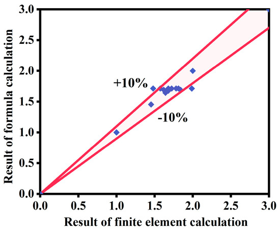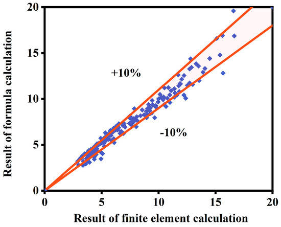 This formula is assumed to be a numerical calculation and yields a dimensionless quantity when calculated. The values of each parameter are determined according to common units. The units for loading displacement, heating time, section size, and external concrete strength are millimeters (mm), minutes (min), millimeters (mm), and megapascals (MPa), respectively. Figure 25 presents a comparison between the calculated viscous damping coefficients and the values predicted by the formula for ST-RC columns after fire on one side under cyclic loading. The comparison results demonstrate that the overall error between the two remains within 10%, indicating strong agreement between the formula calculations and the finite element analysis results. This confirms that the formula can accurately determine the viscous damping coefficient of this type of member under the specified conditions.