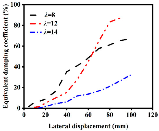 The influence of different slenderness ratios on the ST-RC columns after fire on one side is shown in Figure 19. As the slenderness ratio increases, the energy dissipation capacity of the component decreases after fire on one side. This occurs because at smaller slenderness ratios, the initial stiffness of the component is higher, leading to faster damage accumulation under horizontal cyclic loading. However, due to the protective effect of the core concrete, components with larger slenderness ratios do not experience destabilization. Instead, the equivalent viscous damping coefficient increases as damage progresses.