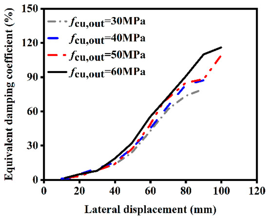 The influence of different external concrete strengths on the ST-RC columns after fire on one side is shown in Figure 22. As shown in the figure, an increase in the strength of the external concrete leads to an improvement in the energy dissipation capacity of the member after fire on one side. This occurs because the external concrete possesses fire resistance capabilities; the higher its strength, the greater the fire resistance of the component, resulting in less damage to the core concrete. Consequently, the energy dissipation capacity of the component is slightly enhanced.