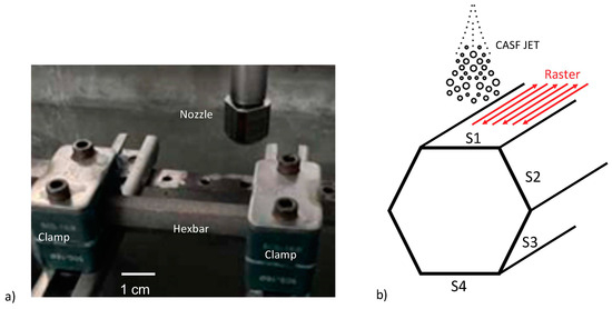 Details of the treatments performed. (a) experimental arrangement, (b) schematic of the Hexbar treatment path and surface labels relative to the jet. Surface S1 is considered the face as it is in the line of sight of the CASF jet.