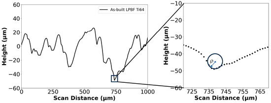 Identifying prominent valleys from surface profiles and measurement of the profile valley root radii (ρ) using a graphical radius gauge. The profile shown is from a hexbar in the as-built condition. Note that only 1 mm of the profile is shown to help view the geometry of individual valleys.