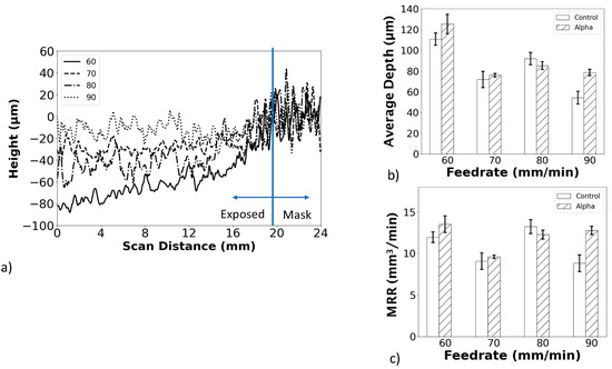 The transition from the treated area to the masked area of the targets is shown in Figure 4a. The depth of material removed from the CASF treatment is evident in this figure and the values for the S1 surface are reported in Figure 4b. The alpha case specimens exhibited greater material removal than the control specimens for most feedrates. The effective material removal rates (MRR) of the CASF process were estimated from the volume of material removed per treatment time and are shown in Figure 4c in terms of feedrate. Due to the larger depth of material removal for the alpha case specimens, the MRR is also generally greater for those specimens with case, with the exception of the treatments conducted at 80 mm/min.