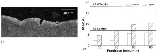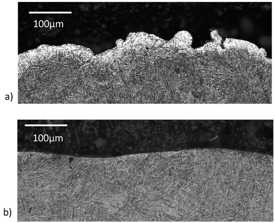 In addition to measuring the roughness and apparent stress concentration factors of the surfaces, the thickness of the alpha case layer was quantified before and after CASF treatment. A representation of the alpha case layers from cross-sectioning the treated specimens, etching and metallographic evaluation is shown in Figure 6a,b, respectively, for the as-built condition and after CASF treatment; this is the S1 surface of the hexbar treated with a feedrate of 60 mm/min. As is evident from the comparison of these two micrographs, the alpha case layer was completely removed. Meanwhile, at the faster feedrates of 80 and 90 mm/min, removal of alpha case appeared to be limited to approximately 50% of the surface, which was likely due to reduction in treatment intensity at the faster feedrates.