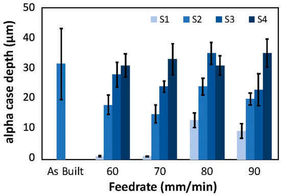 Thickness of the alpha case remaining after CASF treatment with respect to the feedrate. The surfaces S1 to S4 were shown in Figure 1. In the as-built condition, all surfaces have the same case depth.