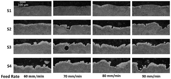 Figure 7 shows results for alpha case thickness measurements post-treatment over the range in feedrates for all four primary surfaces, S1–S4. For lower feedrates of 60 and 70 mm/min, the alpha case was removed from approximately 90% of the S1 surface. There were small “pockets” of alpha case observed in some of the valleys of the treated surface. These pockets appeared to correlate with the deepest valleys, which were apparently shielded from the abrasives and material removal of the CASF process. As evident from the measurements for the surfaces S2 through S4 of Figure 7, the capacity for removing the alpha case decreased with a reduction in normal component of the surface perspective. The surfaces S3 and S4 exhibited limited evidence of alpha case removal with respect to the as-built condition.