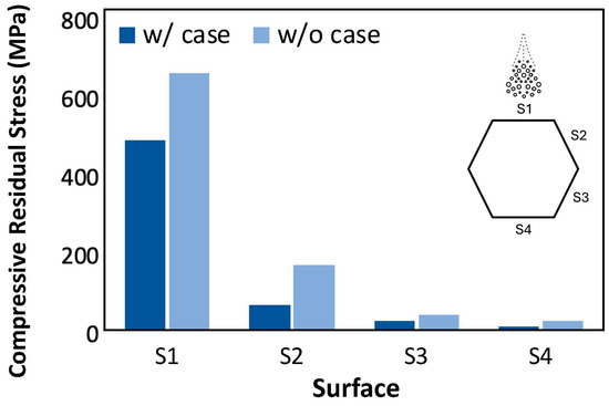 Results of the residual stress measurements on the surfaces of the treated hexbar samples are presented in Figure 10. Both hexbars in this figure were treated by CASF with a feedrate of 60 mm/min. As is evident from Figure 10, the residual stress was consistently compressive in all the surfaces measured and it was greatest in the hexbars without alpha case. The residual stress within the S1 surface of the hexbar without the alpha case reached over 600 MPa, while that in the surfaces oriented obliquely to the incident jet was substantially lower after the CASF treatment. The compressive stress achieved within the S3 and S4 surfaces was less than 50 MPa, which was not significantly different from the residual stress of the as-built surface condition. The residual stress within the S3 and S4 surfaces would not be expected to influence the fatigue response apart from any benefit from the reduction in surface roughness.