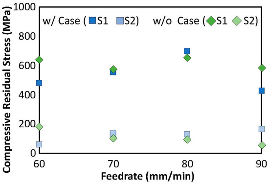 Residual stress on the S1 and S2 surfaces of the hexbars with and without alpha case over the range in feedrates. Note the greater importance of the surface orientation than the presence of alpha case.