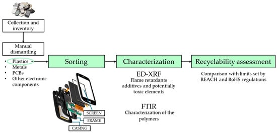 Flowchart of the procedure followed to assess the recyclability of plastic components from EoL mobile phones (PCBs: printed circuit boards; ED-XRF: energy-dispersive X-ray fluorescence spectrometry; FTIR: Fourier-transform infrared spectrometry; REACH: Registration, Evaluation, Authorization and Restriction of Chemicals; RoHS: Restriction of Hazardous Substances).