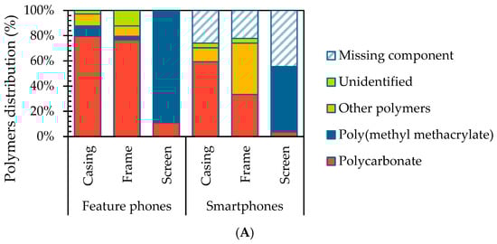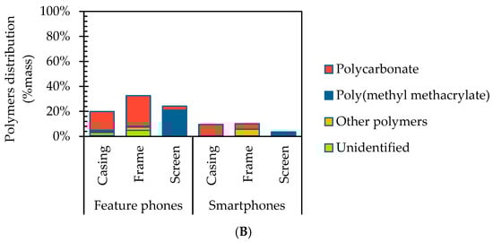 These results highlight the significant prevalence in the plastic components of EoL cell phones of PC and PMMA, as these materials offer exceptional performance in terms of mechanical strength and durability [,]. The greater presence of PC in smartphones (59%) compared to feature phones (56%) may suggest that PC’s properties, such as its toughness and resistance to impact, are increasingly valued in the more advanced, larger plastic components that are typical of smartphones, whereas the lower percentage of PMMA in smartphones (15%) compared to feature phones (30%) could indicate a shift towards alternative materials, such as borosilicate glass, to enhance the technical and aesthetic performance of the liquid crystal displays in smartphones []. Additionally, the presence of “other polymers” in both categories suggests the use of specific blends or polymers for functional requirements, such as the integration of ABS/PC blends or polyamide for enhanced strength and heat resistance in smartphone frames. Eventually, the diversity of polymers used in frames and casings points to a trend of material customization, driven by the increasing complexity of devices and the demand for enhanced design, durability, and performance.