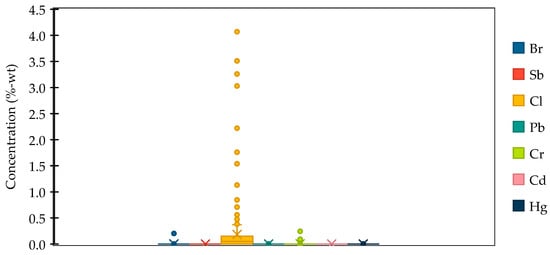 The detected concentrations of hazardous substances, including flame retardant additives (Br and Cl) and potentially toxic elements (PTEs) (Pb, Cr, and Hg) considered by REACH and RoHS regulations are in Figure 3 and in Appendix A, Table A1. Notably, Sb and Cd were not detected in any item. Indeed, according to the literature, the Sb content was lower in waste mobile phones than in any other WEEE category []. Hg was found only in one item (the frame of a feature phone), with a concentration of 0.0017 mg/kg. Cl and Br were the most prominent elements detected, respectively, in 67% of the items, with concentrations between 0.84 mg/kg and 2020 mg/kg and 26% of the items with concentrations ranging between 0.84 mg/kg and 40,700 mg/kg. These findings align with results reported in other studies, where PTEs were found in low concentrations, e.g., between 5 and 340 mg/kg of Pb and 4.6 and 1005 mg/kg for Cd [], while Br was found in 42% of the samples with concentration ranging between 1.8 and 171,000 mg/kg [].