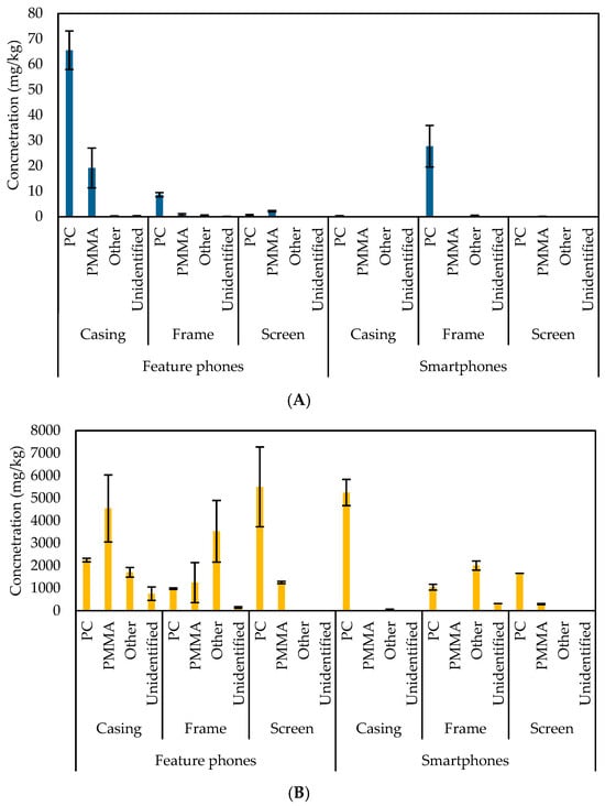 Moreover, while the concentrations of Cl and Pb do not exhibit significant variation across different polymers and components, Br is notably more prevalent in feature phones than in smartphones. In both cell phone types, Pb was prevalent in the PC samples, specifically in the casings of feature phones and the frames of smartphones. A previous study instead identified a positive correlation between the content of Br and the presence of unidentified polymers [].