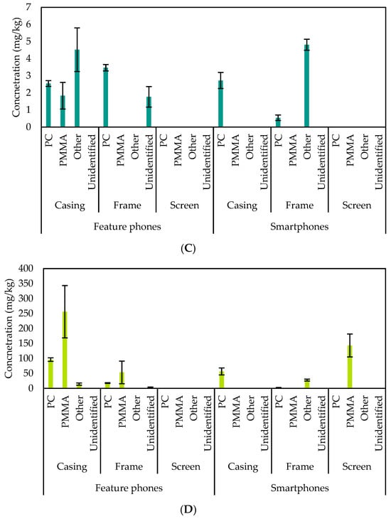 Distribution of the concentration of (A) Br, (B) Cl, (C) Pb, and (D) Cr in casings, frames, and screens and in the identified polymers in the plastic components of EoL cell phones considered in this study.
