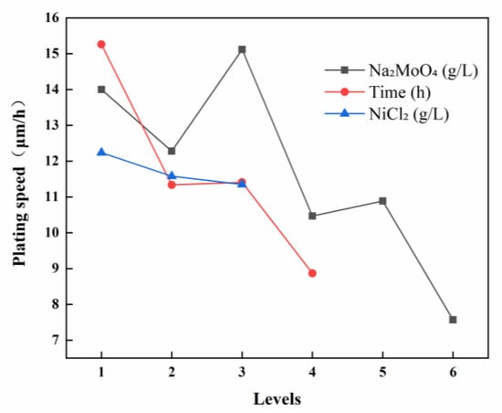 The plating time had the second most significant effect on the deposition rate, with a range value of R = 6.39. As the plating time increased, the overall coating thickness exhibited an increasing trend. With a short duration (1 h), the deposition rate was relatively high, allowing metal ions to rapidly deposit onto the substrate, resulting in fast and uniform coating formation. However, as the plating time was extended to 4 h, the deposition rate decreased, potentially due to the consumption of active components in the plating solution or diffusion limitations, which slowed down the deposition reaction.