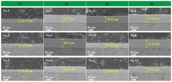 Figure 2 presents the cross-sectional morphology images of 12 sets of Ni-B-Mo composite coatings analyzed using scanning electron microscopy. In experiments No. 1–No. 12, the different concentrations of Na2MoO4 and NiCl2 (g/L) were 0.6/20 (No. 1, No. 7); 5.6/25 (No. 2, No. 8); 10.6/30 (No. 3, No. 9); 15.6/20 (No. 4, No. 10); 20.6/25 (No. 5, No. 11); and 25.6/30 (No. 6, No. 12). Each pair of experiments (e.g., No. 1 and No. 7, No. 2 and No. 8) used the same concentration of Na2MoO4 and NiCl2. In the figure, the Na2MoO4 content increases by 10 g/L from the top to the bottom.
