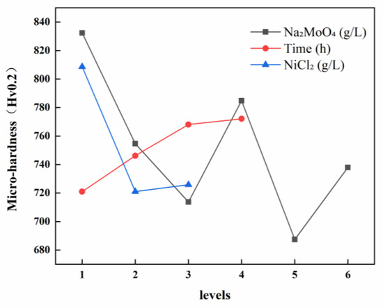 A comprehensive analysis suggested that the optimal experimental combination was A1B4C1 (Na2MoO4 = 0.6 g/L, t = 4 h, NiCl2 = 20 g/L), under which conditions the coating achieved the highest hardness of 881.00 HV.