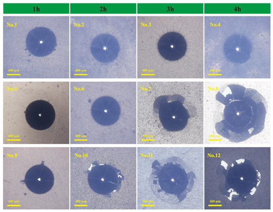 Figure 4 presents the adhesion indentation images of Ni-B-Mo coatings for twelve different combinations of the sodium molybdate concentration, nickel chloride concentration, and plating time (magnification: 139×).