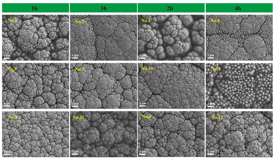 Figure 5 presents the surface scanning electron microscope images of the Ni-B-Mo coatings prepared under different conditions. In experiments No. 1 to No. 12, the different concentrations of Na2MoO4 and NiCl2 (g/L) were 0.6/20 (No. 1, No. 7), 5.6/25 (No. 2, No. 8), 10.6/30 (No. 3, No. 9), 15.6/20 (No. 4, No. 10), 20.6/25 (No. 5, No. 11), and 25.6/30 (No. 6, No. 12), with each pair of codes corresponding to the same concentrations of Na2MoO4 and NiCl2 (e.g., No. 1 and No. 7 both correspond to 0.6/20). The surface of the coatings exhibited a particulate structure, which is characteristic of the columnar growth typical of Ni-B-based electroless plating [23,24,25]. Based on the size of the columnar particles and the surface morphology, the 12 coating groups were classified as having a blackberry shape (No. 1, No. 2), cracked mud appearance (No. 3, No. 7, No. 8), fish egg shape (No. 4), cauliflower shape (No. 5, No. 6, No. 9, No. 10), or broccoli shape (No. 11, No. 12).