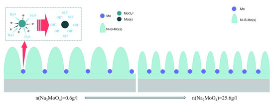 Under the same plating time, the Na2MoO4 concentration increased by 10 g/L (from the top to the bottom in the figure), leading to a gradual reduction in the size of the columnar particles. This was due to the increased Na2MoO4 concentration, which caused the solution to become more supersaturated, accelerating the bonding rate and increasing the number of solid metal compounds, reducing aggregation phenomena and thus resulting in smaller particle growth. This situation was mainly caused by the effect of metal co-deposition. When the Na2MoO4 concentration is low, it accelerates the decomposition and oxidation of borohydride ions, which enhances the reduction of nickel ions to some extent, enabling the co-deposition of a ternary Ni-B-Mo alloy. This plays a catalytic role similar to that of chemicals used to accelerate deposition reactions. When the Na2MoO4 concentration is high, it acts as an inhibitor or stabilizer, similarly to chemicals used to slow down deposition reactions. Free molybdenum adsorbed on the activated metal surface or the newly formed coating surface blocks the bonding of the deposits with the metal or coating. As the Na2MoO4 concentration increased in the plating solution, more free molybdenum was generated on the substrate, resulting in thinner columnar structures, making the morphology of the second and third rows denser with smaller particle sizes compared to the first row, as shown in Figure 6.
