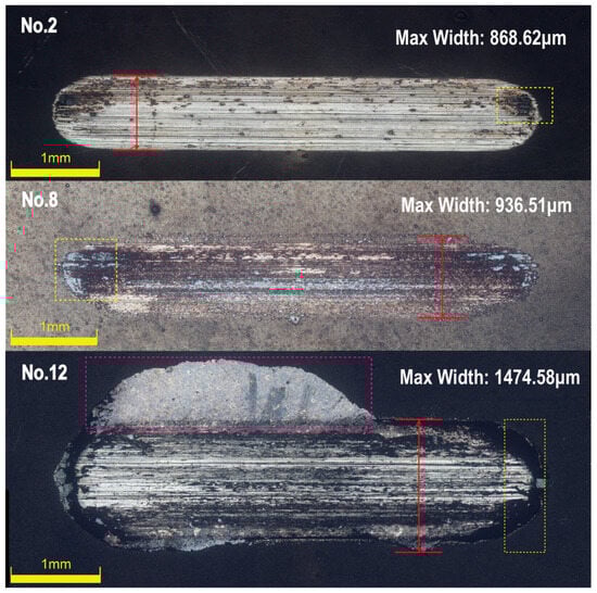 Figure 9 illustrates the wear track morphology of the coatings under different deposition conditions. No. 2 (5.6 g/L Na2MoO4, 2 h, 25 g/L NiCl2) represented the coating deposited under moderate sodium molybdate and nickel chloride concentrations with an optimal deposition time. No. 8 (5.6 g/L Na2MoO4, 4 h, 25 g/L NiCl2) corresponded to the coating deposited under an extended deposition time but with the same moderate sodium molybdate concentration. No. 12 (25.6 g/L Na2MoO4, 4 h, 30 g/L NiCl2) represented the coating formed under a high sodium molybdate concentration, prolonged deposition time, and high nickel chloride concentration.