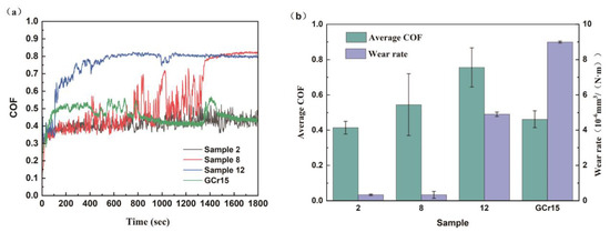 From the perspective of coating adhesion, experimental groups with poor adhesion were first excluded. Consequently, among the 12 experimental groups, 8 groups remained as viable candidates: No. 1, No. 2, No. 4, No. 5, No. 6, No. 8, No. 9, and No. 10. Further analysis of the surface morphology of the Ni-B-Mo coating samples revealed that the No. 4 sample exhibited excessive porosity, leading to its exclusion. Based on an analysis of the deposition rate, the Ni-B-Mo coating demonstrated superior deposition performance when the sodium molybdate concentration was within the range of 5.6–10.6 g/L and the deposition time was between 1.5 and 2.5 h, exhibiting significantly higher deposition rates than those of the other groups. Consequently, groups No. 1, No. 5, No. 6, and No. 10 were excluded. From the perspective of microhardness, a higher hardness value is more suitable for the actual working conditions of GCr15 steel. The microhardness of the No. 9 Ni-B-Mo coating was 699.61 HV0.2, whereas the microhardness values of the No. 2 and No. 8 coatings were 737.49 HV0.2 and 771.94 HV0.2, respectively, both exceeding 700 HV0.2. Therefore, groups No. 2 and No. 8 were selected for the friction and wear tests. To compare the effects of the sodium molybdate concentration, deposition time, and nickel chloride concentration on the wear resistance of the coating, group No. 12 was selected as a time control group. Ultimately, Ni-B-Mo coating samples from groups No. 2, No. 8, and No. 12 in the orthogonal experiment were selected for friction and wear testing alongside the GCr15 substrate.