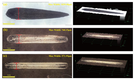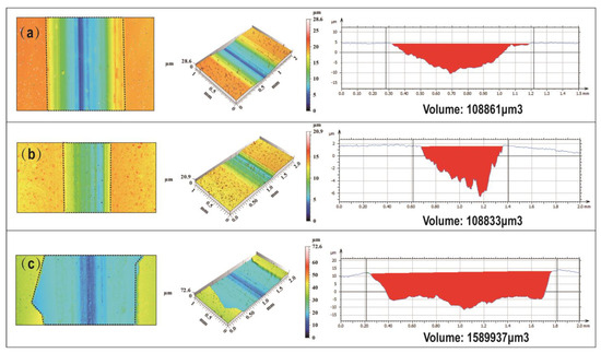 Friction and wear surface morphology after heat treatment: (a) GCr15 steel substrate; (b) optimal Ni-B-Mo coating; (c) optimal Ni-B-Mo coating heat-treated at 400 °C for 1 h.