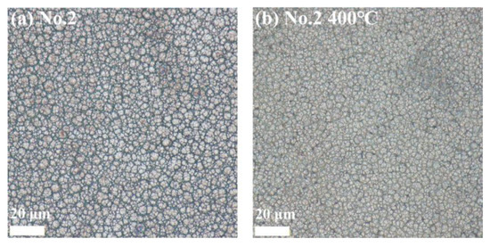 Figure 12, Figure 13 and Figure 14 show the surface morphology of the Ni-B-Mo coatings before and after heat treatment at 400 °C for 1 h. The optimal Ni-B-Mo coating No. 2 (Figure 12) exhibited a fine and evenly distributed spherical particle structure after deposition, while after heat treatment at 400 °C, the boundaries between the particles became blurred, possibly due to grain growth, element diffusion, and an increased coating density. The No. 8 coating (Figure 13), formed under a lower Na2MoO4 concentration (5.6 g/L) and a longer deposition time (4 h), showed a noticeable increase in the particle size, with clear boundaries. After heat treatment at 400 °C, darker regions appeared, possibly due to compound oxidation, and although the particle boundaries remained clear, the particle size increased in certain areas. The No. 12 coating (Figure 14), formed under a higher Na2MoO4 concentration (25.6 g/L) and a longer deposition time (4 h), exhibited a denser particle arrangement, with grain sizes similar to those of No. 2. After heat treatment at 400 °C, the surface morphology changed little, and compared to No. 8, the particle boundaries remained clearer. Overall, the surface morphology of the coatings was minimally affected by heat treatment, with only noticeable changes in the particle boundary definition and color deepening.