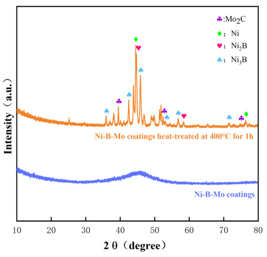 Figure 15 shows the XRD spectra of the optimal Ni-B-Mo coating before and after heat treatment at 400 °C for 1 h. The figure shows that the as-deposited Ni-B-Mo coating had an amorphous structure, which is indicated by the wide peak at around 45° in the XRD spectrum, showing that it was not crystalline. Theoretically, a broad hump should have appeared at 2θ = 45°, but the XRD results showed a sharp peak at 2θ = 44.7°. The main reason for this was that during the heat treatment, the B and Mo elements in the coating formed compounds, which caused the small proportion of the amorphous phase to slowly change to a nanocrystalline state. After holding the heat treatment for 1 h, the number of nanocrystals increased, and the intensity of the characteristic peaks also strengthened. However, XRD analysis revealed that the coating clearly transformed from an amorphous to a crystalline state when it was heat-treated at 400 °C or higher. Nickel crystalline phases (JCPDS No. 70-1849) appeared at 2θ = 44.4° and 76.3°, indicating the crystallization of the nickel phase. Furthermore, the orange spectrum in the figure shows the presence of nickel borides and molybdenum carbide phases after heat treatment at 400 °C, indicating the formation of Ni2B, Ni3B, and Mo2C phases after 1 h of heat treatment at 400 °C. Specifically, the Ni2B phase (JCPDS No. 75-1064) was detected at 2θ = 44.7° and 58.5°; the Ni3B phase (JCPDS No. 82-1699) at 2θ = 36.9°, 42.4°, 46.0°, 53.0°, 56.8°, and 71.4°; and the Mo2C phase (JCPDS No. 31-0871) at 2θ = 39.4°, 52.2°, and 74.7°. It can be concluded that these phases existed as solid solutions in the Ni-B-Mo coating.