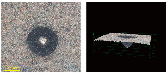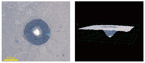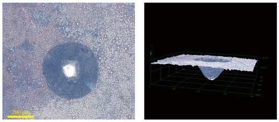 Figure 16, Figure 17 and Figure 18 show the bonding strength of the Ni-B-Mo coating on GCr15 steel under different process conditions. The left side displays 2D surface morphology images, illustrating the crack propagation, while the right side presents 3D morphology images, reflecting the delamination extent of the coating. Figure 16 shows the optimal Ni-B-Mo coating, with a uniform coating overall. The 3D image indicates small pits with a moderate depth, suggesting good bonding strength. Figure 17 shows the morphology of the No. 8 coating (Na2MoO4 = 5.6 g/L, NiCl2 = 25 g/L, t = 2 h) after heat treatment at 400 °C for 1 h, indicating that heat treatment may cause localized heating or phase transformation effects. The pits are more pronounced than in Figure 16, indicating increased delamination and reduced bonding strength. Figure 18 shows the morphology of the No. 12 coating (Na2MoO4 = 25.6 g/L, NiCl2 = 30 g/L, t = 4 h) under the same heat treatment conditions. The cracks were more pronounced, and even crack formation was observed, with severe delamination and the worst bonding strength. This suggests that higher concentrations of Na2MoO4 and NiCl2, as well as longer deposition times, may lead to the excessive internal growth of the coating, reducing its thermal stability. Overall, heat treatment at 400 °C for 1 h significantly impacted the stability of the coating. In the coatings, an excessive solution composition and prolonged deposition times could weaken the bonding strength. The optimal Ni-B-Mo coating on GCr15 steel (Na2MoO4 = 5.6 g/L, NiCl2 = 25 g/L, t = 2 h) maintained excellent bonding strength even after heat treatment.