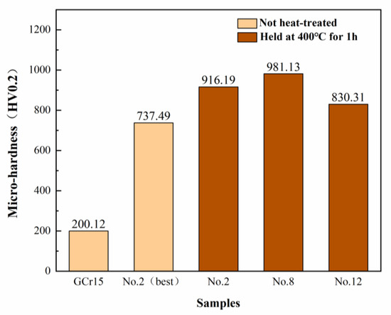 Figure 19 shows the microhardness results for the GCr15 substrate and different Ni-B-Mo coatings before and after heat treatment at 400 °C for 1 h. The light-colored bars represent the hardness before heat treatment, while the dark brown bars represent the hardness after heat treatment at 400 °C for 1 h. According to the data presented in the figure, the hardness of the GCr15 substrate was the lowest at 200.12 HV0.2, while the optimal Ni-B-Mo coating had a hardness of 737.49 HV0.2 before heat treatment. After heat treatment at 400 °C for 1 h with furnace cooling, the hardness significantly increased to 916.19 HV0.2, indicating that heat treatment significantly enhanced the hardness of the Ni-B-Mo coating. The hardness of the No. 8 coating further increased to 981.13 HV0.2 after heat treatment, achieving the highest hardness among all the coatings. In contrast, the hardness of the No. 12 coating after heat treatment was 830.31 HV0.2, which was lower than that of the optimal Ni-B-Mo coating after heat treatment. This also confirms that excessively high concentrations of Na2MoO4 and NiCl2, as well as longer electroless plating times, still affect the effectiveness of hardness enhancement after heat treatment.