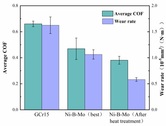 Figure 22 shows the average friction coefficient and wear rate of the GCr15 steel substrate and the optimal Ni-B-Mo coating before and after heat treatment. The friction coefficients were 0.66018, 0.46918, and 0.381, respectively. The wear rates were 1.6252, 1.0632, and 0.5816 × 10−5 mm3/(N·m), respectively. The wear rate of the heat-treated optimal Ni-B-Mo coating was 64% and 45% lower than that of GCr15 steel and that of the non-heat-treated Ni-B-Mo coating, respectively. According to the Archard equation [34], the wear rate is inversely proportional to the hardness. After heat treatment, the Ni-B-Mo coating formed higher-hardness compounds on its surface, which reduced the surface wear during the friction process, resulting in the lowest wear rate of the heat-treated Ni-B-Mo coating. These results indicate that the optimized optimal Ni-B-Mo coating significantly improved the wear resistance of GCr15 steel, and the heat-treated coating further enhanced the wear resistance.