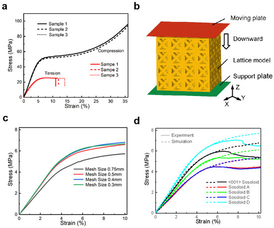 Experimental and numerical results: (a) the stress–strain curve of tension and compression of Rigid 10 material; (b) simulation model; (c) the mesh convergence of the model; (d) the comparison of experimental and simulated stress–strain curves.