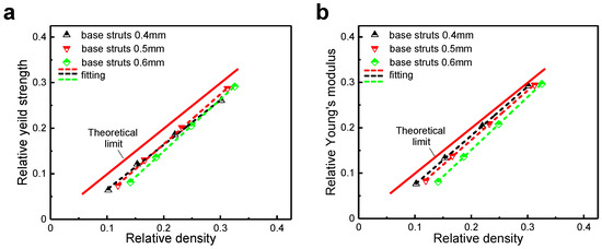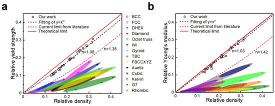 The relationship between (a) relative yield strength and (b) relative Young’s modulus as functions of the relative density of lattice structures that are strengthened along the loading direction [11,21,22,23,28,29,37,38,39,40,41,42].