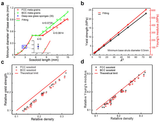 Effects of geometry and configuration of [001]-strengthened sosoloid on mechanical properties and numerical results: (a) the relationship between the minimum base strut diameter and sosoloid length; (b) the mechanical properties of sosoloids with different grain sizes and their quadratic relationship; (c,d) the comparison of the relative yield strength and relative Young’s modulus of FCC and BCC sosoloids.