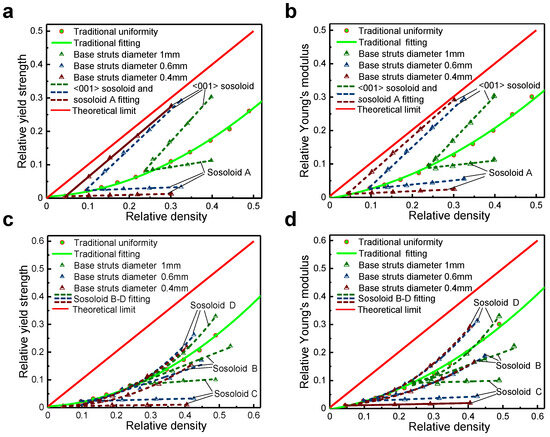The relationship between relative yield strength, relative Young’s modulus and relative density for lattice structures composed of [001]-strengthened and other sosoloids: (a,b) [001]-strengthened sosoloid and sosoloid A; (c,d) sosoloids B through D.
